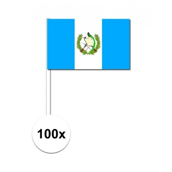 100x Guatemalaanse zwaaivlaggetjes 12 x 24 cm. Set van 100 papieren zwaaivlaggetjes met opdruk van de Guatemalaanse vlag. Materiaal vlaggetje: papier, stokje: plastic. Formaat per vlaggetje: 12 x 24 cm, formaat stokje: 40 cm lang.