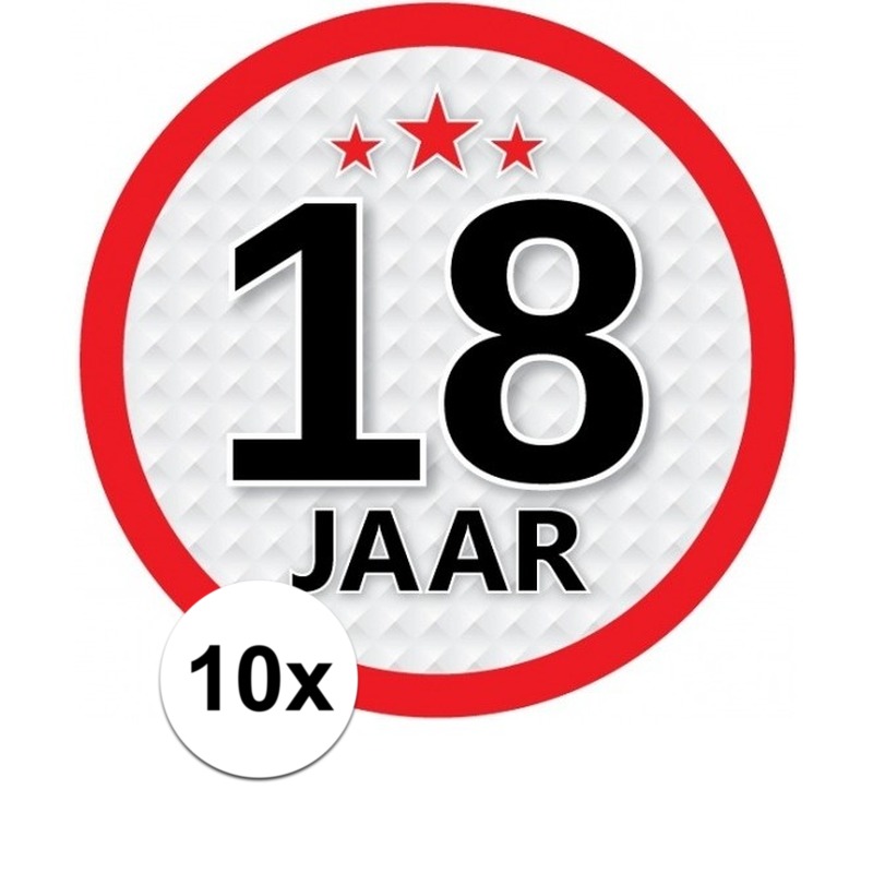10x 18 jaar leeftijd versiering sticker rond. Een leuke ronde sticker met het cijfer 18. Leuk als versiering voor een 18e verjaardag, een jubileum of iets anders met dit cijfer. De diameter van deze sticker is ongeveer 15 cm. Verjaardag/jubileum feestversiering artikelen.