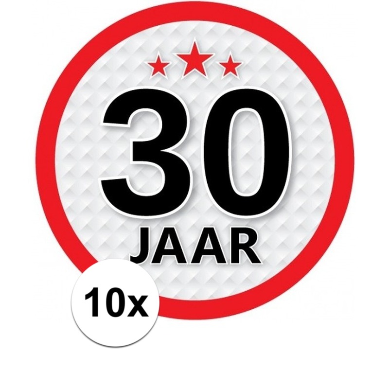 10x 30 jaar leeftijd versiering sticker rond. Een leuke ronde sticker met het cijfer 30. Leuk als versiering voor een 30e verjaardag, een jubileum of iets anders met dit cijfer. De diameter van deze sticker is ongeveer 15 cm. Verjaardag/jubileum feestversiering artikelen.