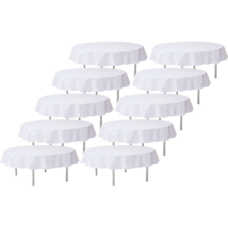 10x Bruiloft witte ronde tafelkleden/tafellakens 240 cm non woven polypropyleen. Ronde tafeldecoratie kleden van witte non woven materiaal. De tafelkleden zijn geschikt voor gebruik binnenshuis (binnen/indoor) en voor gebruik buitenshuis (buiten/outdoor) bij goede weersomstandigheden.