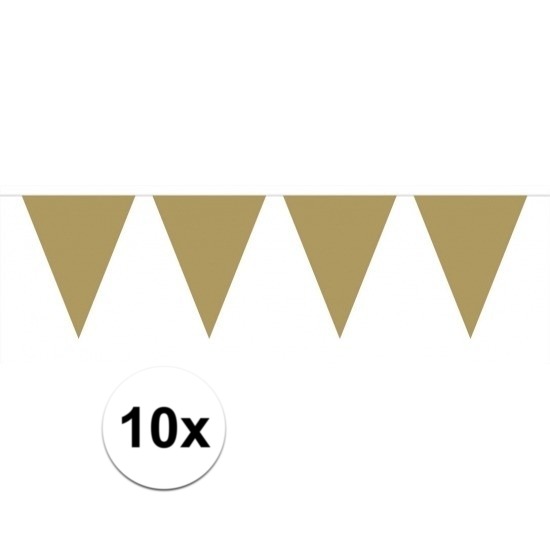 10x stuks vlaggenlijnen XL goud. Deze gouden vlaggenlijn is gemaakt van plastic en heeft een lengte van 6 meter. De vlaggenlijn bevat 10 vlaggetjes met een afmeting van 42 x 28 cm. Dubbelzijdig bedrukt, geschikt voor binnen gebruik en niet brandvertragend.