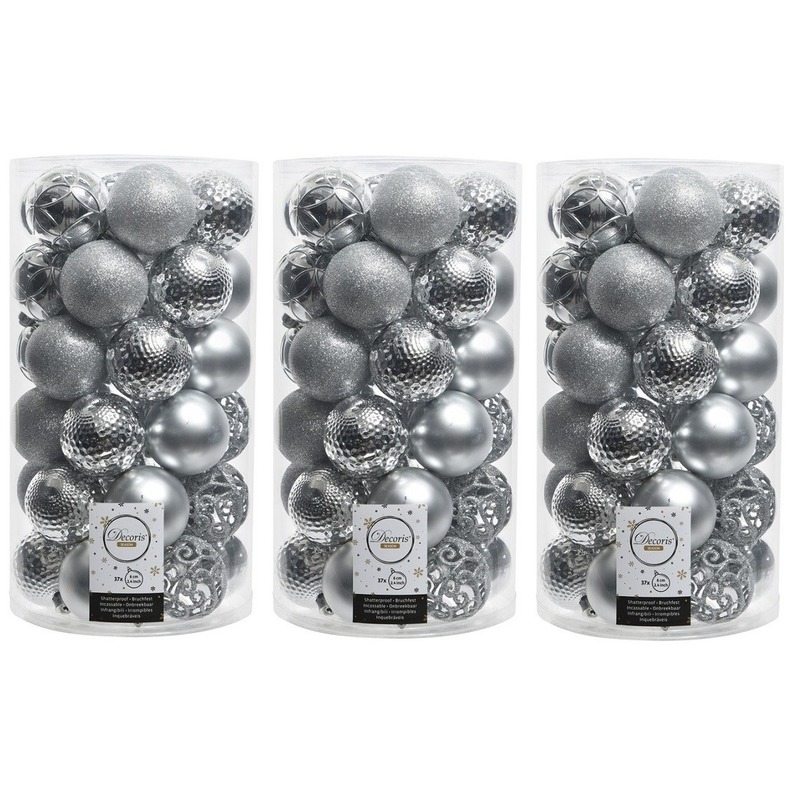 111x Zilveren kerstballen 6 cm kunststof mix. Set van 111x zilveren onbreekbare kerstballen met zilveren ophanglintjes. De set bevat 21x glanzende, 18x matte, 18x glitter, 18x open glitter, 18x glanzende golf en 18x glanzende cirkel kerstballen. Kerst versiering/decoratie voor het optuigen van uw kerstboom. Onze kerstballen worden standaard geleverd met ophangdraadjes maar wij adviseren u om onze kerstbalhaakjes mee te bestellen (niet inbegrepen). Materiaal: kunststof/plastic. Formaat diameter: 6 cm. Kleur: zilver. Serie: Christmas Silver. U ontvangt 3 verpakkingen van 37 stuks.