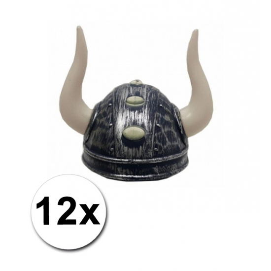 Viking helmen met hoorns, 12 stuks. Zilverkleurige viking helmen geschikt voor volwassenen en gemaakt van plastic. De omtrek van de helm is ca. 57 cm.