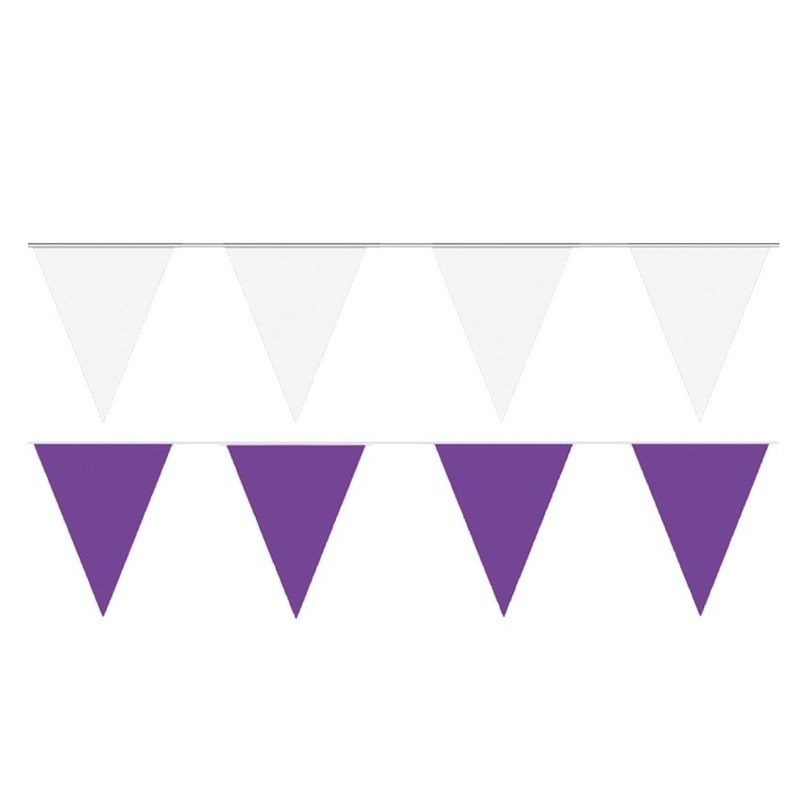 Witte en paarse vlaggetjes pakket. Totaal 120 meter vlaggetjes. Materiaal: plastic. , Dit artikel bestaat uit:, 6x Party Vlaggenlijn puntvlaggetjes – kunststof – wit – 10 meter – Slinger – versiering, 6x Party Vlaggenlijn puntvlaggetjes – kunststof – paars – 10 meter – Slinger – versiering