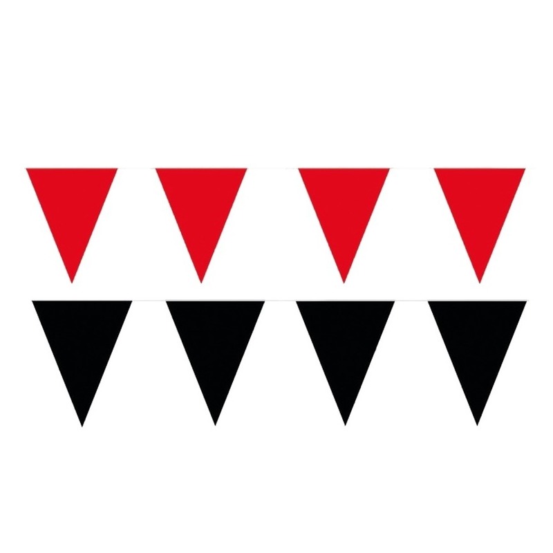 Zwart en rode vlaggetjes pakket. Totaal 120 meter vlaggetjes. Materiaal: plastic. , Dit artikel bestaat uit:, 6x Party Vlaggenlijn puntvlaggetjes – kunststof – rood – 10 meter – Slinger – versiering, 6x Party Vlaggenlijn puntvlaggetjes – kunststof – zwart – 10 meter – Slinger – versiering