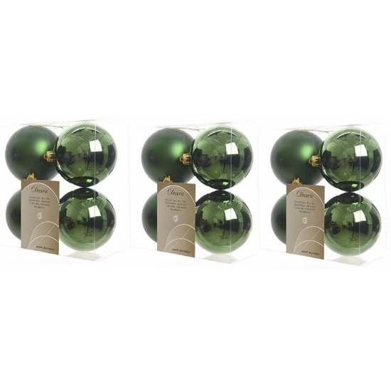 12x Donkergroene kerstballen 10 cm kunststof mat/glans. 3 Sets van 4x donkergroene onbreekbare kerstballen met gouden ophanglintjes. De ene helft is glanzend en de andere helft zijn matte kerstballen. Kerst versiering/decoratie voor het optuigen van uw kerstboom. Onze kerstballen worden standaard geleverd met ophangdraadjes maar wij adviseren u om onze kerstbalhaakjes mee te bestellen (niet inbegrepen). Materiaal: kunststof/plastic. Formaat diameter: 10 cm. Kleur: donkergroen. Serie: Christmas Pine Green. U ontvangt 3 setjes van 4 stuks.