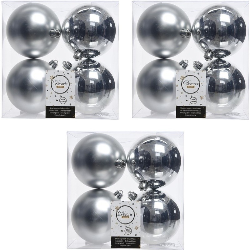 12x Zilveren kerstballen 10 cm kunststof mat/glans. Set van 12x zilveren onbreekbare kerstballen met zilveren ophanglintjes. De ene helft is glanzend en de andere helft zijn matte kerstballen. Kerst versiering/decoratie voor het optuigen van uw kerstboom. Onze kerstballen worden standaard geleverd met ophangdraadjes maar wij adviseren u om onze kerstbalhaakjes mee te bestellen (niet inbegrepen). Materiaal: kunststof/plastic. Formaat diameter: 10 cm. Kleur: zilver. Serie: Christmas Silver. U ontvangt 3 verpakkingen van 4 stuks.