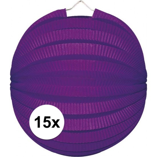 15x Paarse bol lampionnen. Hoogte: ongeveer 22 cm. Diameter: ongeveer 20 cm. Materiaal: papier. In deze lampionnen kunnen geen waxinelichtjes of andere kaarsjes. Niet brandvertragend. U ontvangt 15 lampionnen.