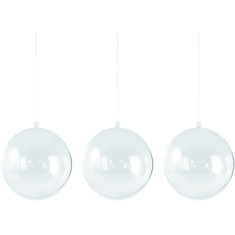 15x Plastic transparante bollen om zelf kerstballen van te maken. De transparante bollen zitten verpakt per stuk en zijn ongeveer 12 cm in diameter. De twee losse helften kunt u op elkaar klikken nadat u er decoratie in heeft gedaan of in/op heeft bevestigd. U ontvangt 3 stuks.