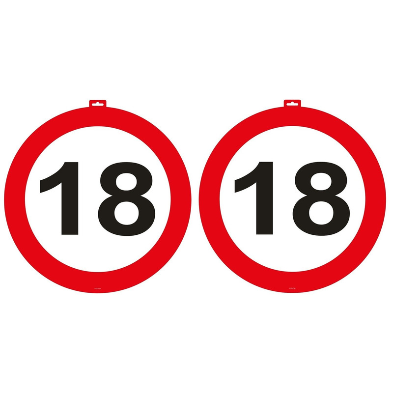 2 stuks verkeersbord of deurbord van leeftijd 18 jaar. Verjaardag versiering en feestartikelen. Een deur decoratie bord in de vorm van een verkeersbord met daarop het cijfer 18. Materiaal: karton. Diameter: ca. 47 cm.