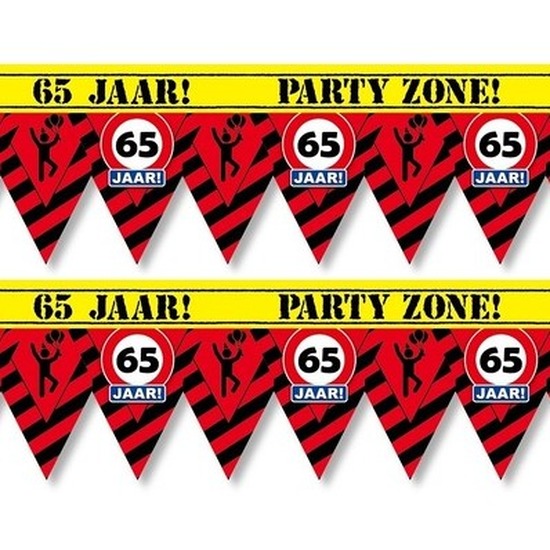 Deze 65 jaar pensioen afzetlinten met vlaggenlijnpuntjes zijn enkelzijdig bedrukt. Materiaal: plastic. Lengte: 12 meter. Feestversiering/feestdecoratie afzetlinten/markeerlinten feestartikelen voor het pensioenfeest van een 65 jarige. Danger zone party tape mini vlaggenlijn. U ontvangt 2 stuks.