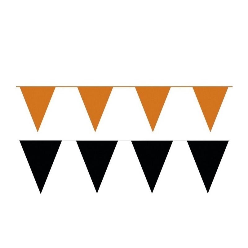 Zwart en oranje vlaggetjes pakket. Totaal 200 meter vlaggetjes. Materiaal: plastic. , Dit artikel bestaat uit:, 10x Party Vlaggenlijn puntvlaggetjes – kunststof – zwart – 10 meter – Slinger – versiering, 10x Vlaggenlijn – 20 vlaggetjes – oranje – 10 meter