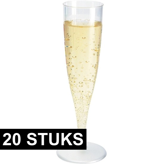 20x Champagne glazen transparant plastic. Een setje van 20 stuks kunststof transparante champagne glazen. Formaat hoogte: ongeveer 19 cm. Formaat diameter: ongeveer 5 cm. Inhoud per stuk: ongeveer 135 ml. Champagneglazen voor Oud en Nieuw, verjaardag of een themafeest. U ontvangt 2 set met 10 stuks plastic champagneglazen. Let op: deze champagneglazen zijn gemaakt van hard plastic en daardoor herbruikbaar.