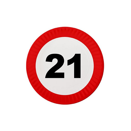 Kartonnen feestbordjes 21 jaar leeftijd verjaardag versiering. 16x stuks kartonnen borden met stopbord design en cijfer 21. De bordjes hebben een diameter van ongeveer 23 cm. 21 jaar verjaardag/feest thema wegwerpborden van karton. Tafeldecoratie feestartikelen en versiering voor de jarige.