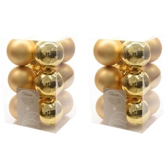 24x Gouden kerstballen 6 cm kunststof mat/glans. Set van 24x gouden onbreekbare kerstballen met gouden ophanglintjes. De ene helft is glanzend en de andere helft zijn matte kerstballen. Kerst versiering/decoratie voor het optuigen van uw kerstboom. Onze kerstballen worden standaard geleverd met ophangdraadjes maar wij adviseren u om onze kerstbalhaakjes mee te bestellen (niet inbegrepen). Materiaal: kunststof/plastic. Formaat diameter: 6 cm. Kleur: goud. Serie: Christmas Light Gold. U ontvangt 2 verpakkingen van 12 stuks.