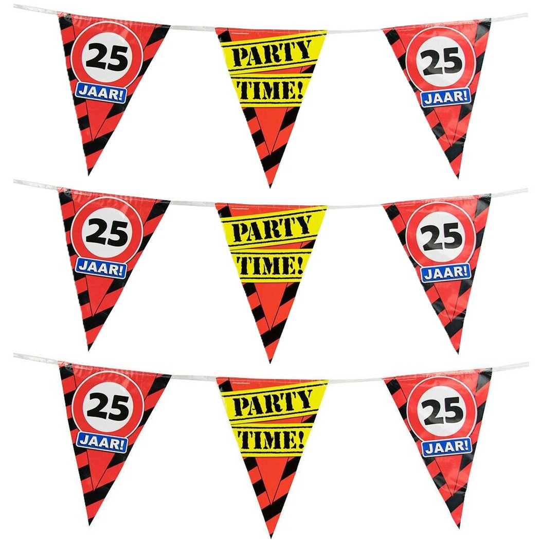 3x 25 jaar verjaardag thema vlaggenlijnen met waarschuwingsborden van 10 meter. Deze vlaggenlijnen hebben 8 meter aan vlaggetjes en aan beide zijden 1 meter lint. De vlaggenlijn is geschikt voor buiten. Materiaal: plastic. Leeftijden feestartikelen en versieringen.