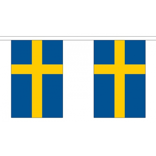 Buiten vlaggenlijn Zweden 3 meter. Deze luxe vlaggenlijnen met de Zweedse vlag is gemaakt van 100% polyester en is ongeveer 3 meter lang. De vlaggenlijn bevat 10 vlaggetjes met een formaat van 22,5 x 15 cm. Zweden landen thema supporter feestartikelen en versieringen. U ontvangt 2 stuks.