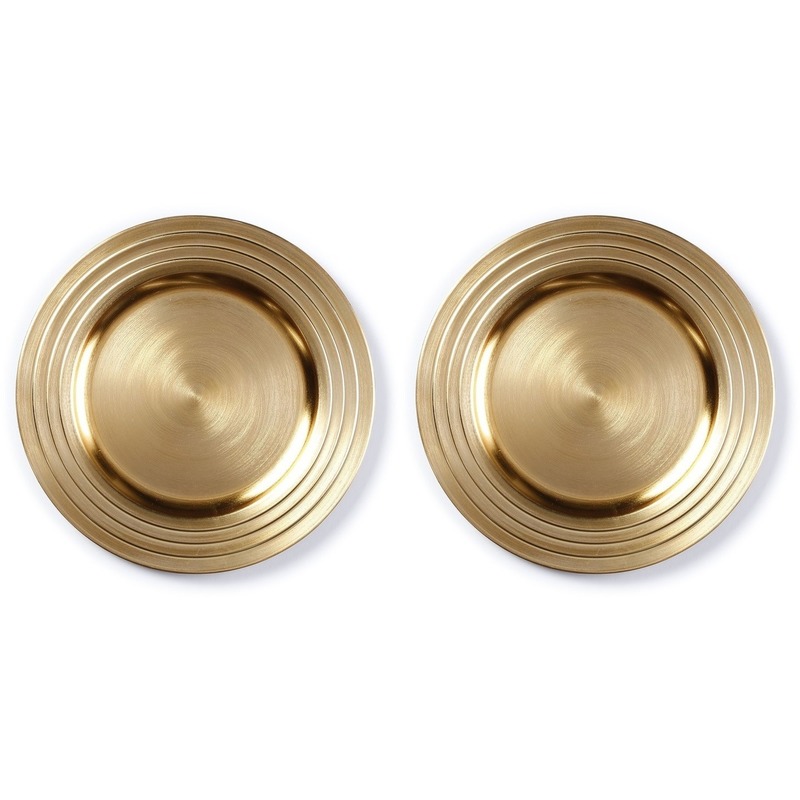 2x Diner/kerstdiner borden/onderborden goud 33 cm rond. Rond goud onderbord/bord die te gebruiken is onderbord bij bijvoorbeeld het kerstdiner. Materiaal: kunststof. Het formaat van dit bord is in diameter 33 cm. Aantal: 2x.