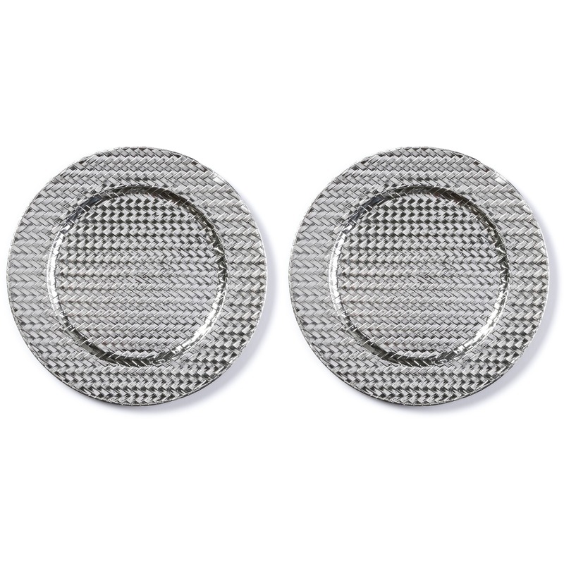 2x Diner/kerstdiner borden/onderborden zilver structuur 33 cm rond. Rond zilver onderbord/bord die te gebruiken is onderbord bij bijvoorbeeld het kerstdiner. Materiaal: kunststof. Het formaat van dit bord is in diameter 33 cm. Aantal: 2x.