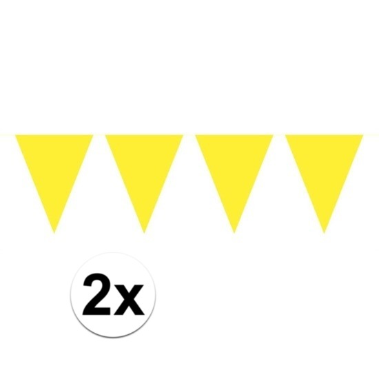 2 Mini vlaggenlijn / slinger versiering geel. De lengte van deze gele slinger is ca. 3 meter. De hoogte van de vlaggetjes is ca. 14 cm. Materiaal: Plastic.