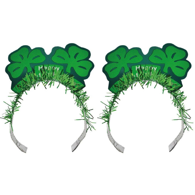 Klavertje drie diadeem St. Patricks day. Feestelijke groene haarband met glinsterende details waarop Happy St. Patricks Day staat tussen twee grote klavertjes drie. Geschikt voor volwassenen. U ontvangt 2 stuks. St. Patricksday verkleedaccessoires haarbanden/diademen.