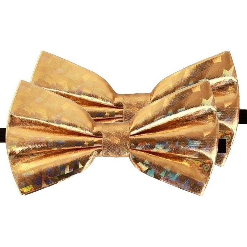 2x Holografisch gouden verkleed vlinderstrikjes/vlinderdasjes 13 cm voor dames/heren. Reeds gestrikte gouden strikken/dassen met een elastieken band met haak en oog sluiting voor rond de hals, die u kunt verstellen middels een schuifje. Handige strik die u niet zelf hoeft te strikken. Materiaal: polyester, kunststof. Formaat: 13 cm x 7 cm. Holografisch goud thema Carnaval/feest verkleedaccessoires/feestartikelen voor volwassenen. U ontvangt 2 stuks.