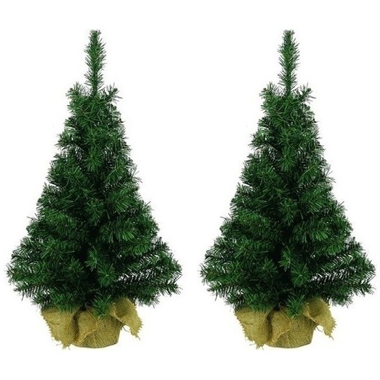 2x Groene kunst kerstbomen 90 cm met jute zak/kluit. Kunstbomen/nep kerstboompjes met jute zak en een verzwaarde kluit. De bomen worden verpakt geleverd en de takken dient u zelf uit te vouwen. Kunstkerstbomen kopen en zelf versieren. Materiaal: pvc, kunststof/plastic, jute. Formaat diameter bomen: 15-46 cm, hoogte bomen: 90cm, diameter kluit: 5 cm. Aantal takjes: 118. Kleur: groen/wit. U ontvangt 2 stuks.