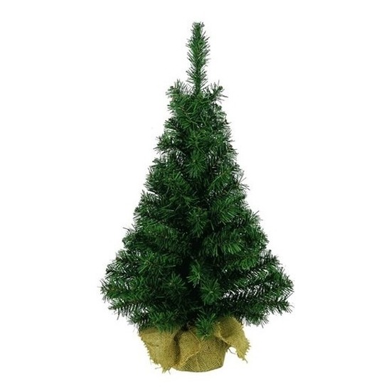 2x Kleine kerstboom in jute zak 75 cm. Deze volle mini kerstboom heeft 81 takken en is gemaakt van 100% PVC.