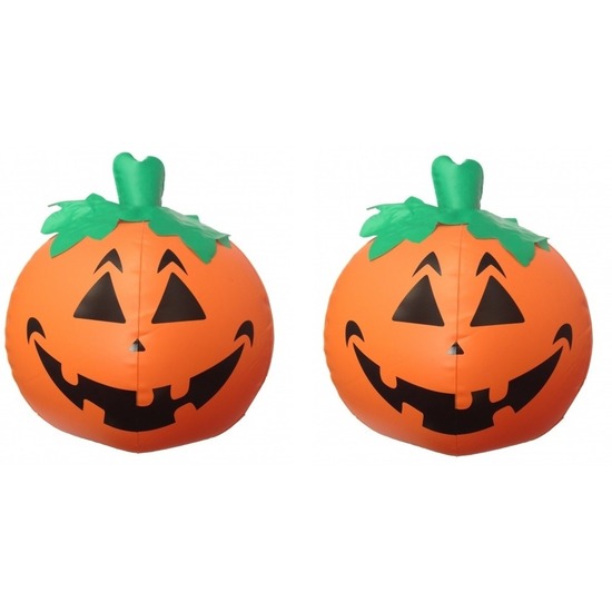 2x Opblaasbare pompoenen met LED lampje. De decoratieve pompoen is een handig brandveilig alternatief voor de klassieke handgesneden pompoen met kaarsje. Aan de onderkant van de pompoen zit een vakje voor het Led lampje. Formaat: omtrek ongeveer 65 cm wanneer opgeblazen, hoogte ongeveer 24 cm. Horror/Halloween thema decoratie. U ontvangt 2 stuks.