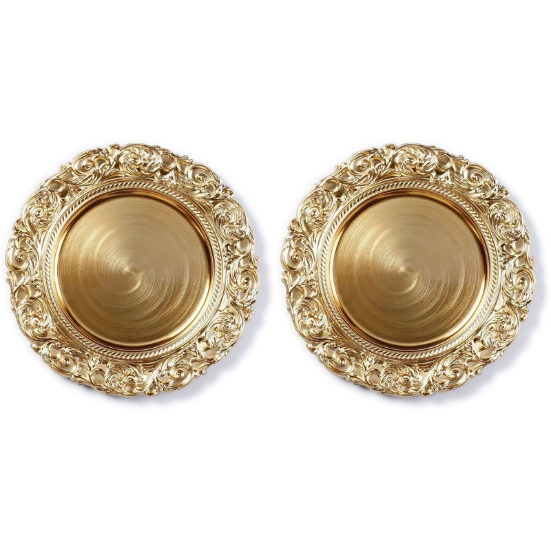2x Diner borden/onderborden goud met decoratieve rand 33 cm rond. Rond gouden onderbord/bord die te gebruiken is onderbord bij bijvoorbeeld het kerstdiner. Materiaal: kunststof. Het formaat van dit bord is in diameter 33 cm. Aantal: 2x.