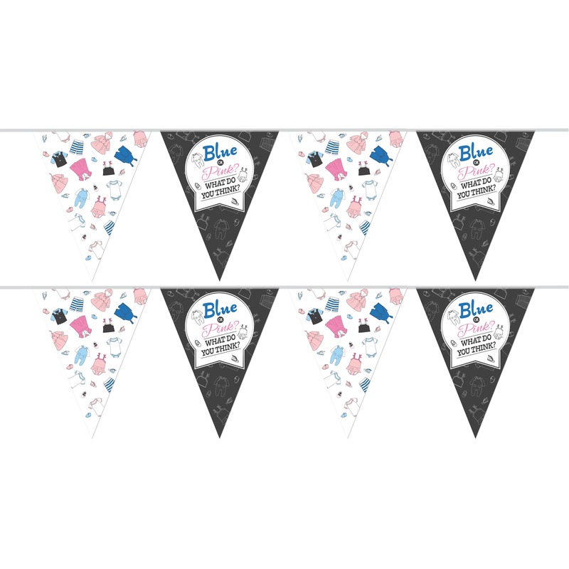 2x Vlaggenlijnen gender reveal party/feest slingers 10 meter. Vlaggetjes met de tekst: Blue or Pink, what do you think? Maak je gender reveal party compleet met deze slingers. Lengte per slinger: 10 meter.