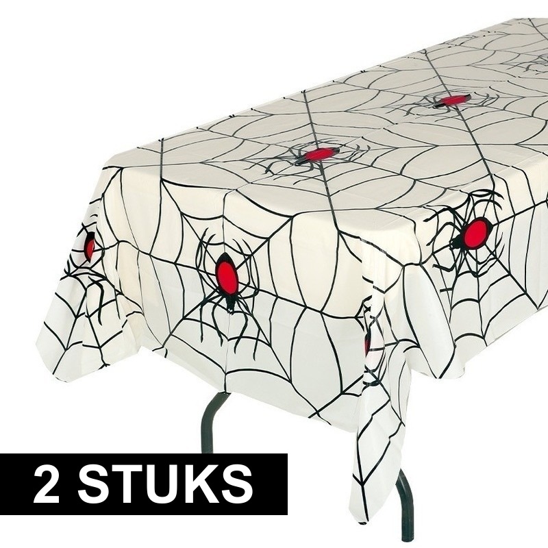 2x Een Halloween tafelkleed met spinnenwebben en spinnen, in de kleur wit. Afmeting: 135 x 270 cm. Materiaal: plastic. Wasvoorschrift: enkel afnemen met een vochtige doek. Halloween/horror tafeldecoratie tafelkleed/tafellaken/tafelzeil. U ontvangt 2 stuks.