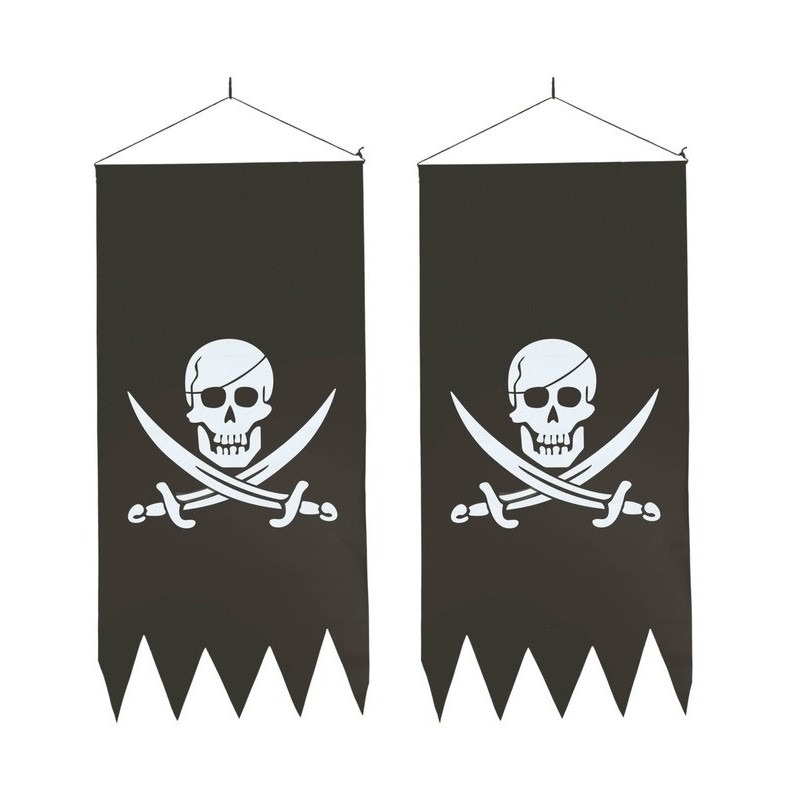 2x Piratenvlaggen/banners met schedel. Deze vlag heeft een formaat van ongeveer 43 x 86 cm. De piratenvlag is geschikt voor binnen en uitermate geschikt voor Halloween, carnaval en/of een piraten themafeestje. Materiaal: polyester/papier. Halloween/horror/carnaval piraat thema versiering. U ontvangt 2 stuks.