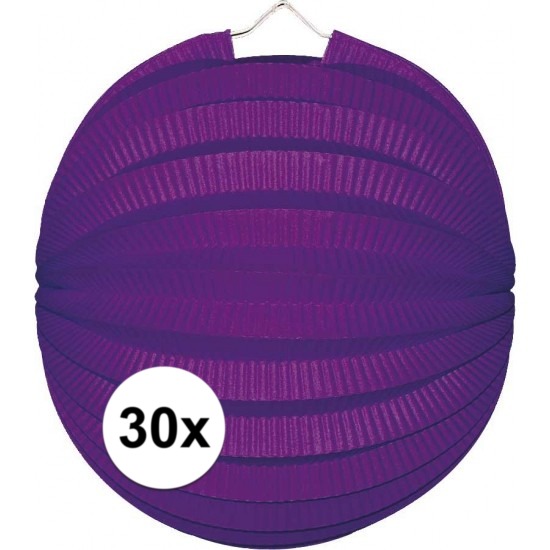 30x Paarse bol lampionnen. Hoogte: ongeveer 22 cm. Diameter: ongeveer 20 cm. Materiaal: papier. In deze lampionnen kunnen geen waxinelichtjes of andere kaarsjes. Niet brandvertragend. U ontvangt 30 lampionnen.