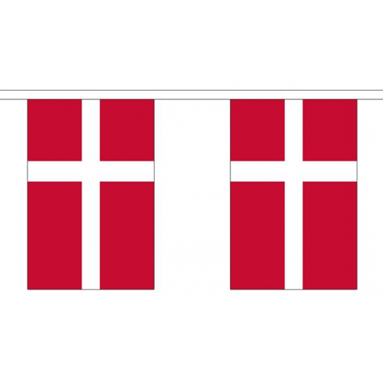 Buiten vlaggenlijn Denemarken 3 meter. Deze luxe vlaggenlijnen met de Deense vlag is gemaakt van 100% polyester en is ongeveer 3 meter lang. De vlaggenlijn bevat 10 vlaggetjes met een formaat van 22,5 x 15 cm. Denemarken landen thema supporter feestartikelen en versieringen. U ontvangt 3 stuks.