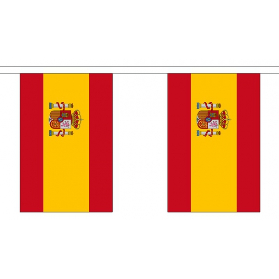 Buiten vlaggenlijn Spanje 3 meter. Deze luxe vlaggenlijnen met de Spaanse vlag is gemaakt van 100% polyester en is ongeveer 3 meter lang. De vlaggenlijn bevat 10 vlaggetjes met een formaat van 22,5 x 15 cm. Spanje landen thema supporter feestartikelen en versieringen. U ontvangt 3 stuks.