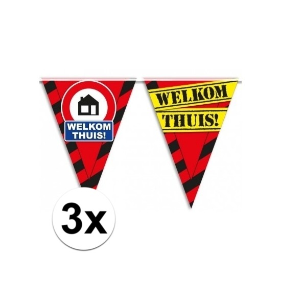 3x vlaggenlijn waarschuwingsbord 10mtr met de opdruk: Welkom thuis!! Deze vlaggenlijn heeft 8 meter aan vlaggetjes en aan beide zijden 1 meter lint. De vlaggenlijnen zijn geschikt voor buiten. Materiaal: plastic. U ontvangt 3 losse vlaggenlijnen.