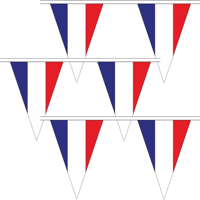 3x Polyester vlaggenlijn Frankrijk 5 meter. Stoffen Franse vlaggenlijn van 100% polyester. De lengte van deze vlaggenlijn is ongeveer 5 meter en de grootte per vlaggetje is ongeveer 30 x 20 cm. Er zitten 12 vlaggetjes aan de vlaggenlijn en de vlaggenlijn kan zowel binnen als buiten worden opgehangen. U ontvangt 3 stuks. Franse vlag landen decoratie.