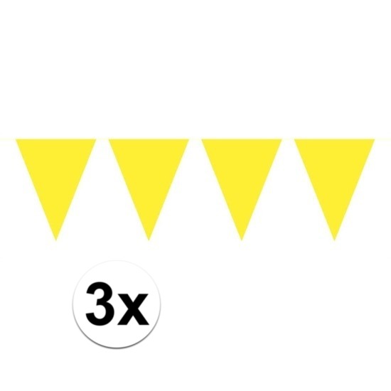 3 Mini vlaggenlijn / slinger versiering geel. De lengte van deze gele slinger is ca. 3 meter. De hoogte van de vlaggetjes is ca. 14 cm. Materiaal: Plastic.