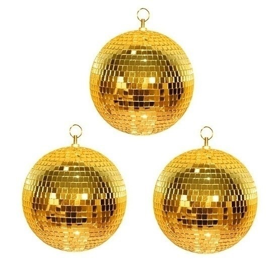 3x Disco spiegel ballen goud 30 cm. Mooie spiegelbal om het disco effect mee te cre?ren. Er moet een lamp gericht worden op de bal. De discobal heeft een diameter van ongeveer 30 cm. Discoballen themafeest decoratie. U ontvangt 3 stuks.