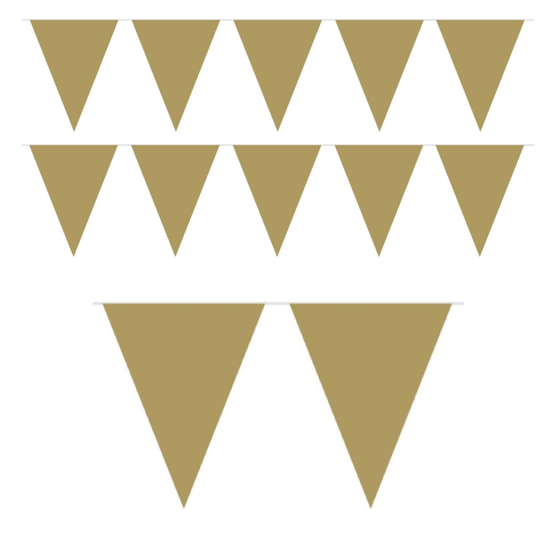 3x Mini vlaggenlijn / slinger goud. De lengte van deze slinger is ca. 3 meter. De hoogte van de vlaggetjes is ca. 14 cm. Materiaal: Plastic.