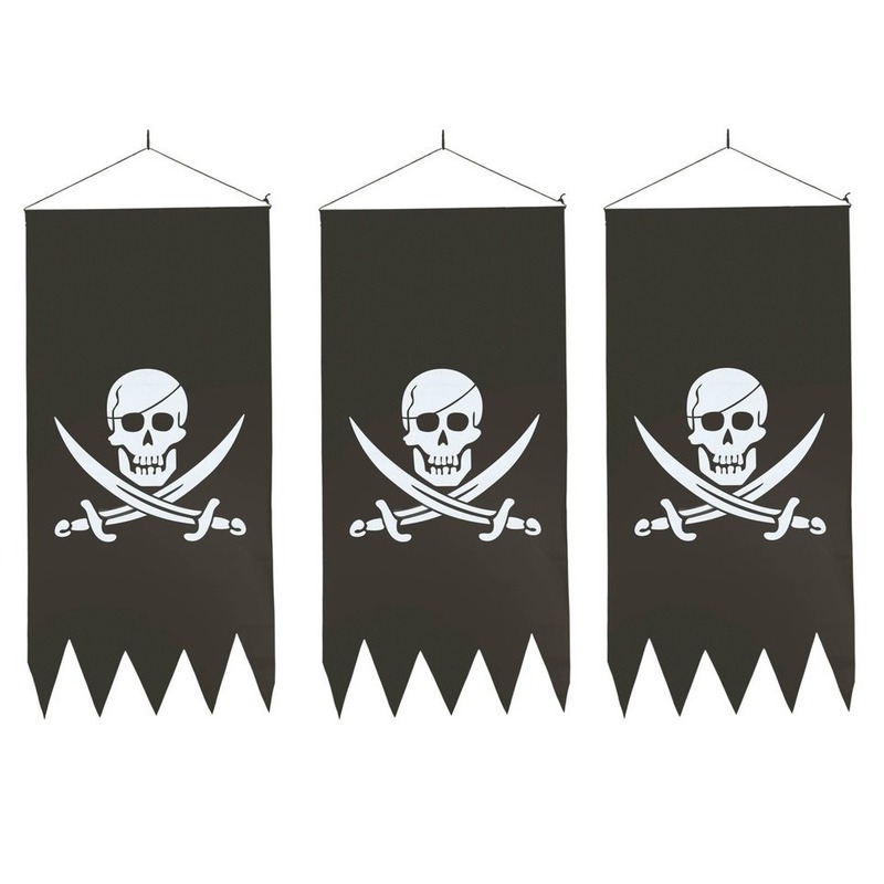 3x Piratenvlaggen/banners met schedel. Deze vlag heeft een formaat van ongeveer 43 x 86 cm. De piratenvlag is geschikt voor binnen en uitermate geschikt voor Halloween, carnaval en/of een piraten themafeestje. Materiaal: polyester/papier. Halloween/horror/carnaval piraat thema versiering. U ontvangt 3 stuks.