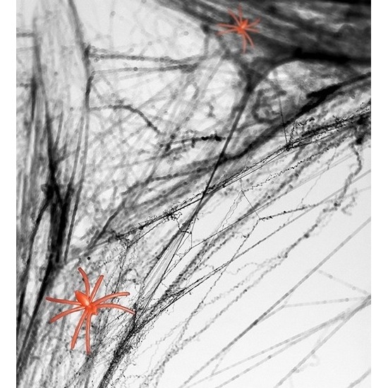 3x Zwarte spinnenweb decoratie met 2 spinnen. Griezelige spinnenweb decoratie in zwart met 2 rood/oranje plastic spinnetjes. Het web wordt geleverd als bol/prop met synthetische spinnenrag die u zelf tot griezelig web kunt draperen/ophangen. U ontvangt 3 stuks.