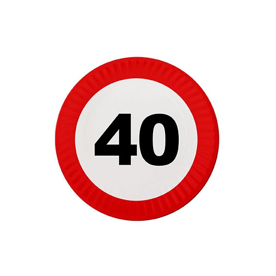 Kartonnen feestbordjes 40 jaar leeftijd verjaardag versiering. 16x stuks kartonnen borden met stopbord design en cijfer 40. De bordjes hebben een diameter van ongeveer 23 cm. 40 jaar verjaardag/feest thema wegwerpborden van karton. Tafeldecoratie feestartikelen en versiering voor de jarige.