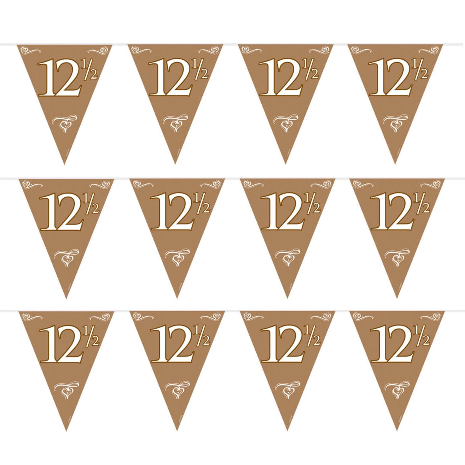 kleurige vlaggenlijn voor een koperen huwelijks jubileum. Voor meer 12,5 jaar jubileum feestartikelen kunt u ook in deze webshop terecht. De jubileum vlaggenlijn is ongeveer 6 meter lang. Materiaal: plastic. U ontvangt 4 stuks.