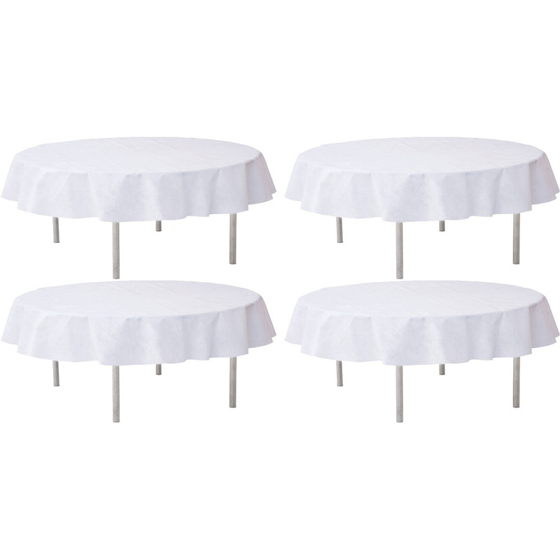 4x Bruiloft witte ronde tafelkleden/tafellakens 240 cm non woven polypropyleen. Ronde tafeldecoratie kleden van witte non woven materiaal. De tafelkleden zijn geschikt voor gebruik binnenshuis (binnen/indoor) en voor gebruik buitenshuis (buiten/outdoor) bij goede weersomstandigheden.