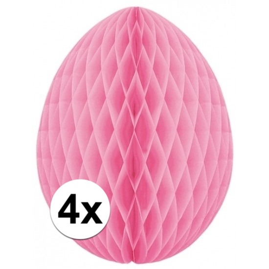 4x Lichtroze papieren honeycomb paasei om op te hangen. Het paasei bevat twee plakstrips waarmee u het ei vast kunt plakken na het uitvouwen. Indien u Het paasei vaker wenst te gebruiken kunt u deze ook vastzetten met paperclips (niet meegeleverd). Het paasei is gemaakt van brandvertragend crepepapier.