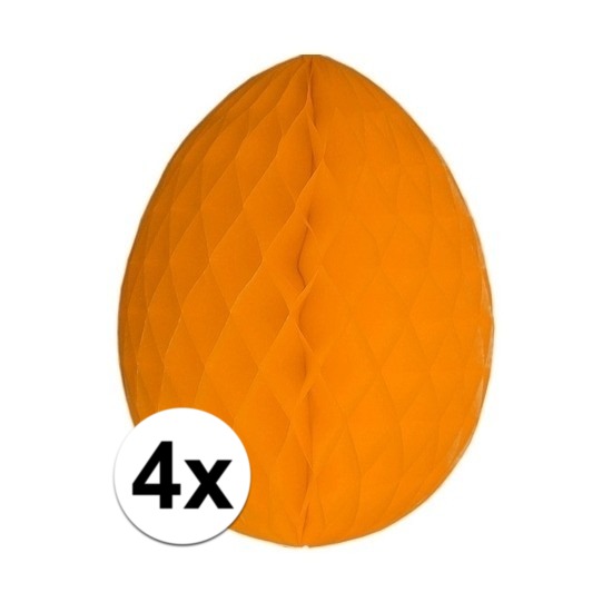 4x Oranje papieren honeycomb paasei om op te hangen. Het paasei bevat twee plakstrips waarmee u het ei vast kunt plakken na het uitvouwen. Indien u het paasei vaker wenst te gebruiken kunt u deze ook vastzetten met paperclips (niet meegeleverd). Het paasei is gemaakt van brandvertragend crepepapier.