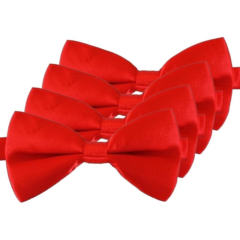 4x Rode verkleed vlinderstrikjes/vlinderdasjes 12 cm voor dames/heren. Reeds gestrikte rode strik/das met een elastieken band met haak en oog sluiting voor rond de hals, die u kunt verstellen middels een schuifje. Handige strik die u niet zelf hoeft te strikken. Materiaal: polyester, kunststof. Formaat: 12 cm x 6,5 cm. U ontvangt 4 strikjes. Rood thema Carnaval/feest verkleedaccessoires/feestartikelen voor volwassenen.
