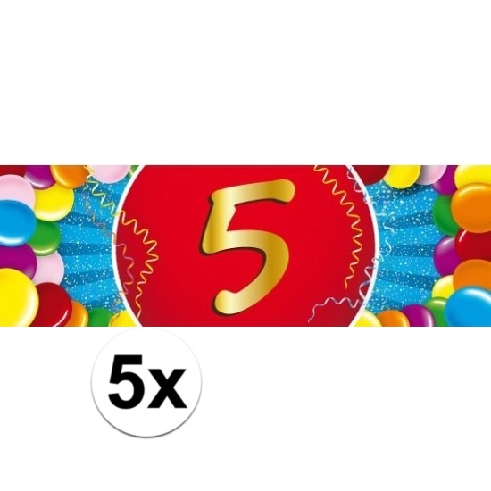 5x 5 jaar leeftijd versiering sticker. Een vrolijk gekleurde sticker met het cijfer 5. Leuk als versiering voor een 5e verjaardag. Het formaat van deze sticker is 19,6 x 6,5 cm. 5 jaar verjaardag/jubileum feestversiering artikelen.
